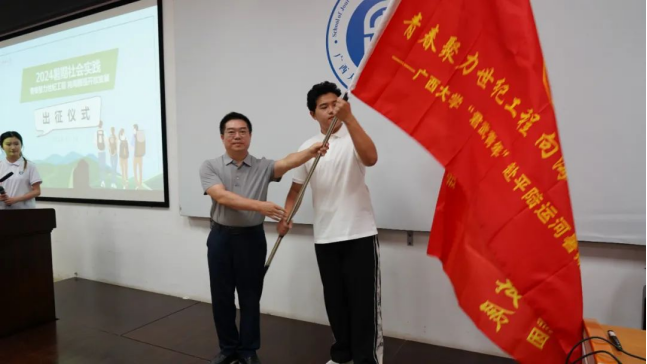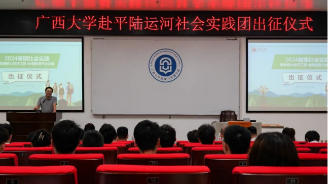 出征仪式现场,新闻与传播学院党委书记银健老师发表讲话。他指出,党的二十届三中全会出台了《中共中央关于进一步全面深化改革、推进中国式现代化的决定》,而平陆运河工程作为广西壮族自治区在推动中国式现代化、壮美广西建设中的一项重要举措,受到了中央、自治区和学校的高度关注。我校四院联合组织的此次暑期社会实践活动,正当其时、恰逢其势,将为推动平陆运河工程的建设与发展贡献青春力量。银健书记强调,在实践过程中,团队成员应牢固树立安全意识、专业意识、问题意识和成果意识,真正做到受教育、长才干、做贡献,将青春的汗水和智慧的火花挥洒在壮丽的广西建设之中,为推进中国式现代化的伟大征程贡献力量。