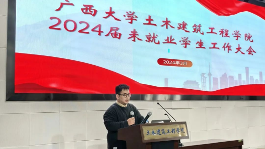 本次动员大会邀请到了中建三局国际公司人力经理牛滢为毕业生进行就业指导,牛滢结合土木行业毕业生就业数据和当前经济发展形势,就“工程类专业依然正逢其时”以及“建筑业未来应以十四五规划为发展目标”进行客观分析,并结合自身的工作经验、从岗信息、就业政策等对毕业生就业注意事项进行讲解指导,鼓励同学们明确市场需求与个人职业发展规划,把握好就业机会,尽早谋划和准备。