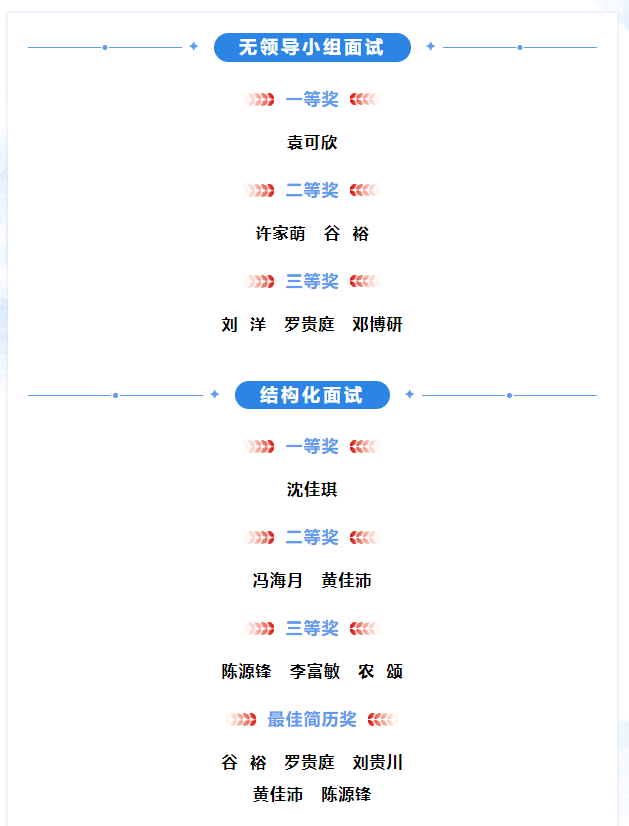 演讲结束后,刘尚俊结合自身实际经验逐个分析参赛选手的表现,鼓励同学们在面试中不要害怕犯错,自信大方的表现更容易获取好感。李广聪对同学们的表现给予积极肯定,并提出面试中我们要以解决问题为根本出发点和落脚点,以获取评委认同为最终目标。卢霞敏就面试的相关礼仪问题给予参赛同学诸多建议,希望参赛同学注意细节,重视着装整理,保持面带微笑,学会与面试官眼神交流等。