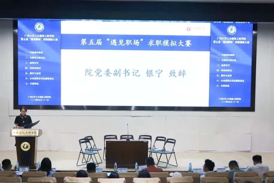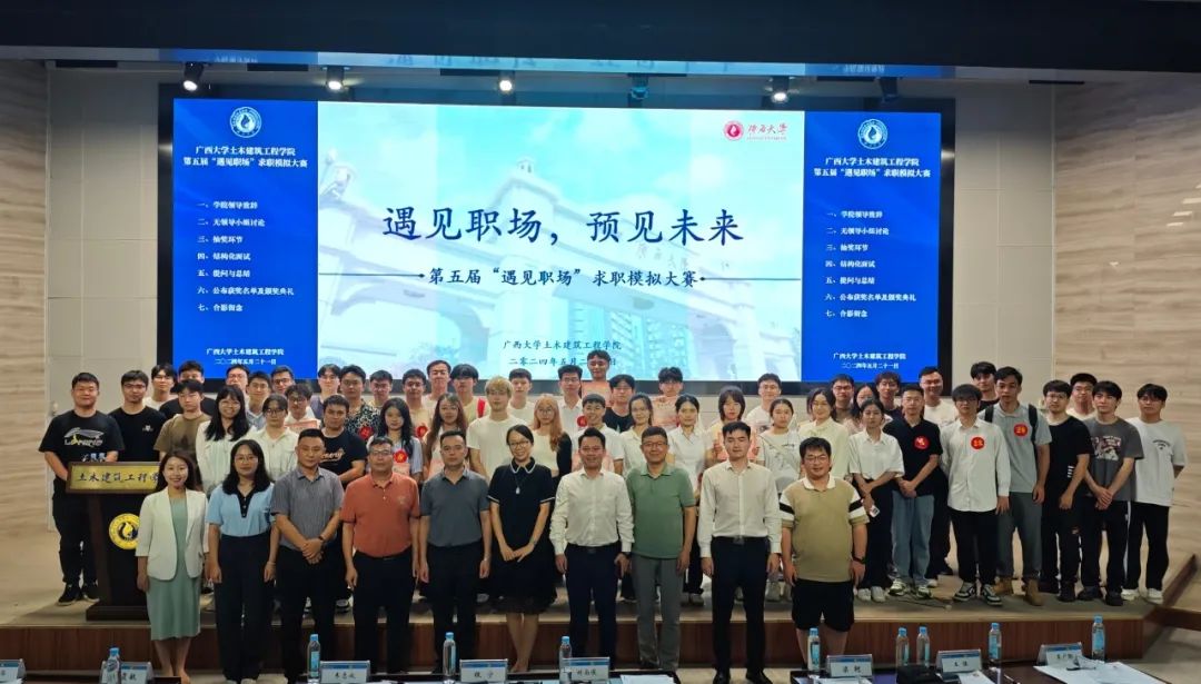 本次比赛邀请到广西珠委南宁勘测设计院有限公司副总经理韦志成,广西新发展交通集团有限公司上思至防城港等高速公路指挥协调部部长刘尚俊,中建八局南方公司基础设施分公司办公室主任梁轲,中建五局华南公司广西分公司人力资源部经理卢霞敏,中公教育广西研究院院长王强,广西珠委南宁勘测设计院有限公司综合部副主任唐荣华,中建八局南方公司广西分公司人力资源部李广聪担任专家评委。学院党委副书记银宁,学院团委副书记潘桂祯,学工组老师陆源出席本次活动。
