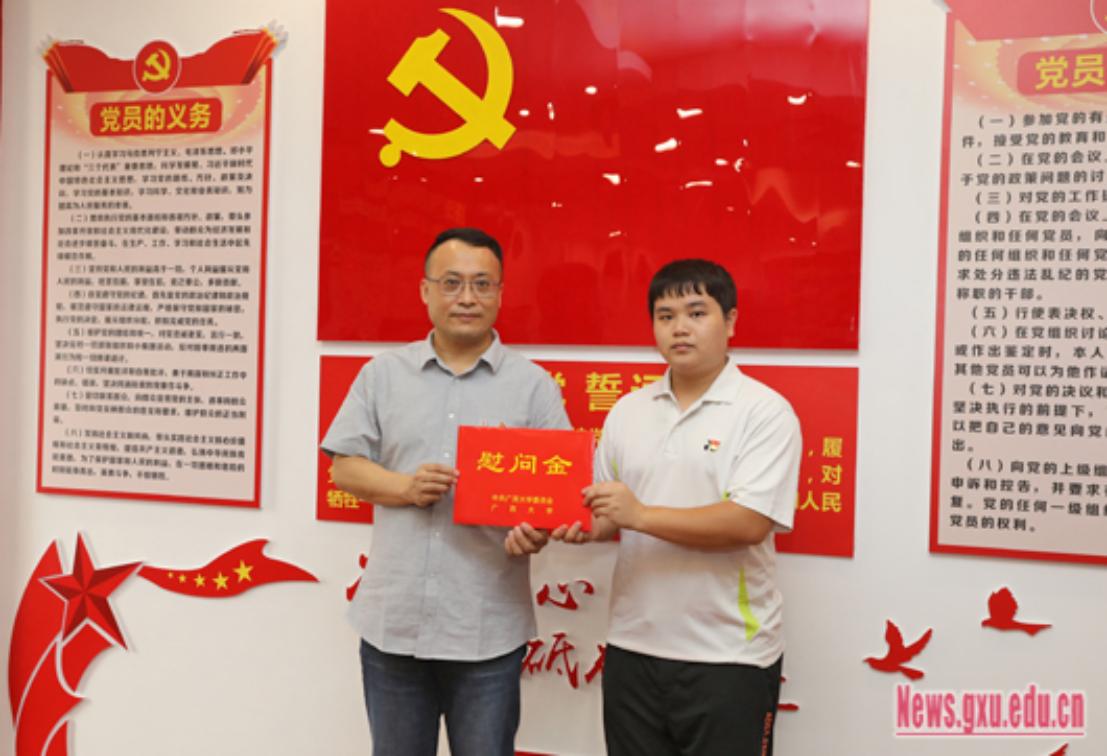 吴尽昭与丁健同学亲切交谈,关切询问了丁健同学在工作、学习、生活等方面的情况,了解他的困难和需求,并代表学校党委向他送上节日的祝福和慰问金,勉励其克服困难,努力学习,励志前行,进一步发挥党员先锋模范带头作用。丁健同学对学校的关心和培养由衷地表示感激,他表示今后一定要加倍努力学好知识本领,不辜负学校党委和老师们的关怀与期望,以更好的成绩回报母校、服务社会、报效祖国。