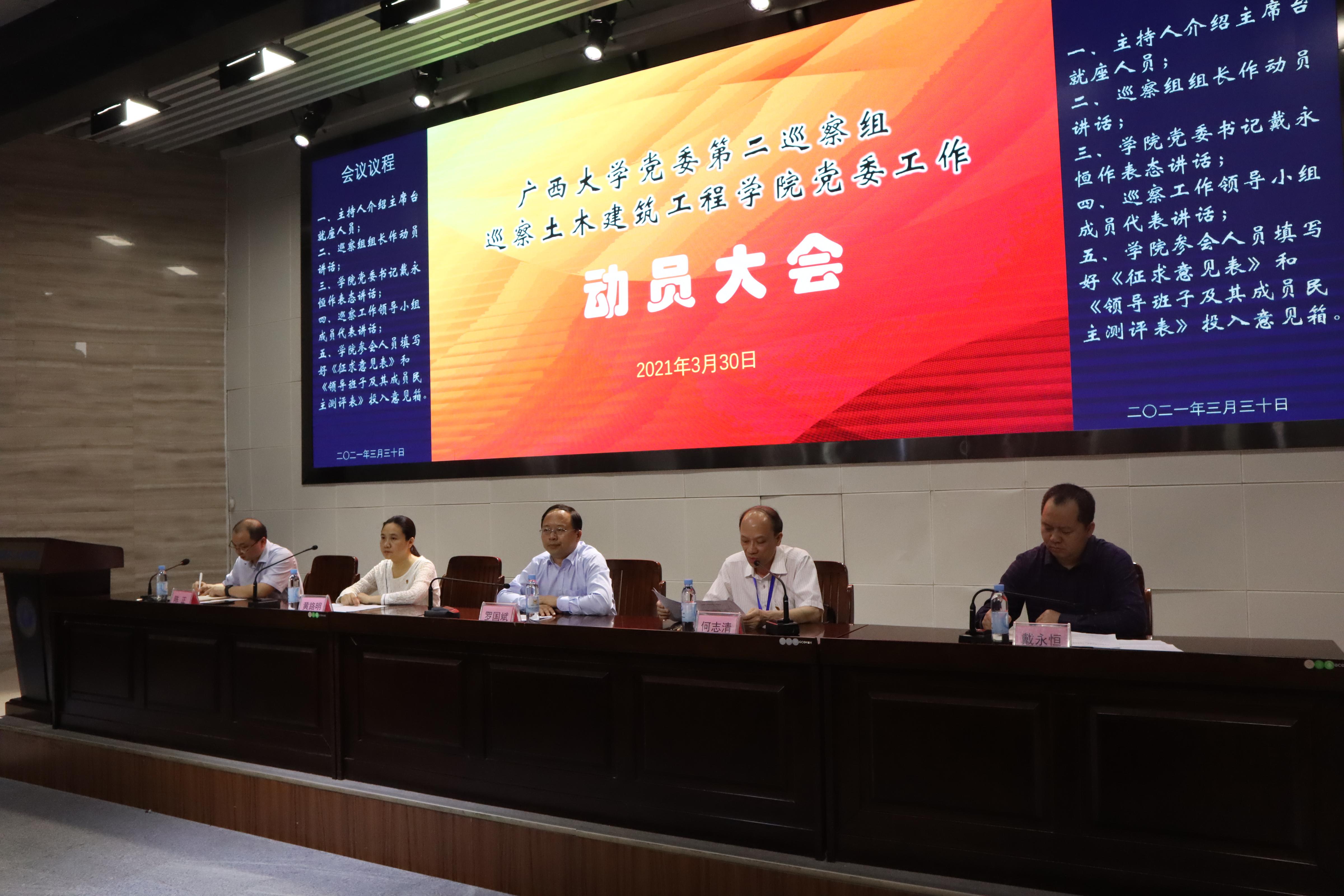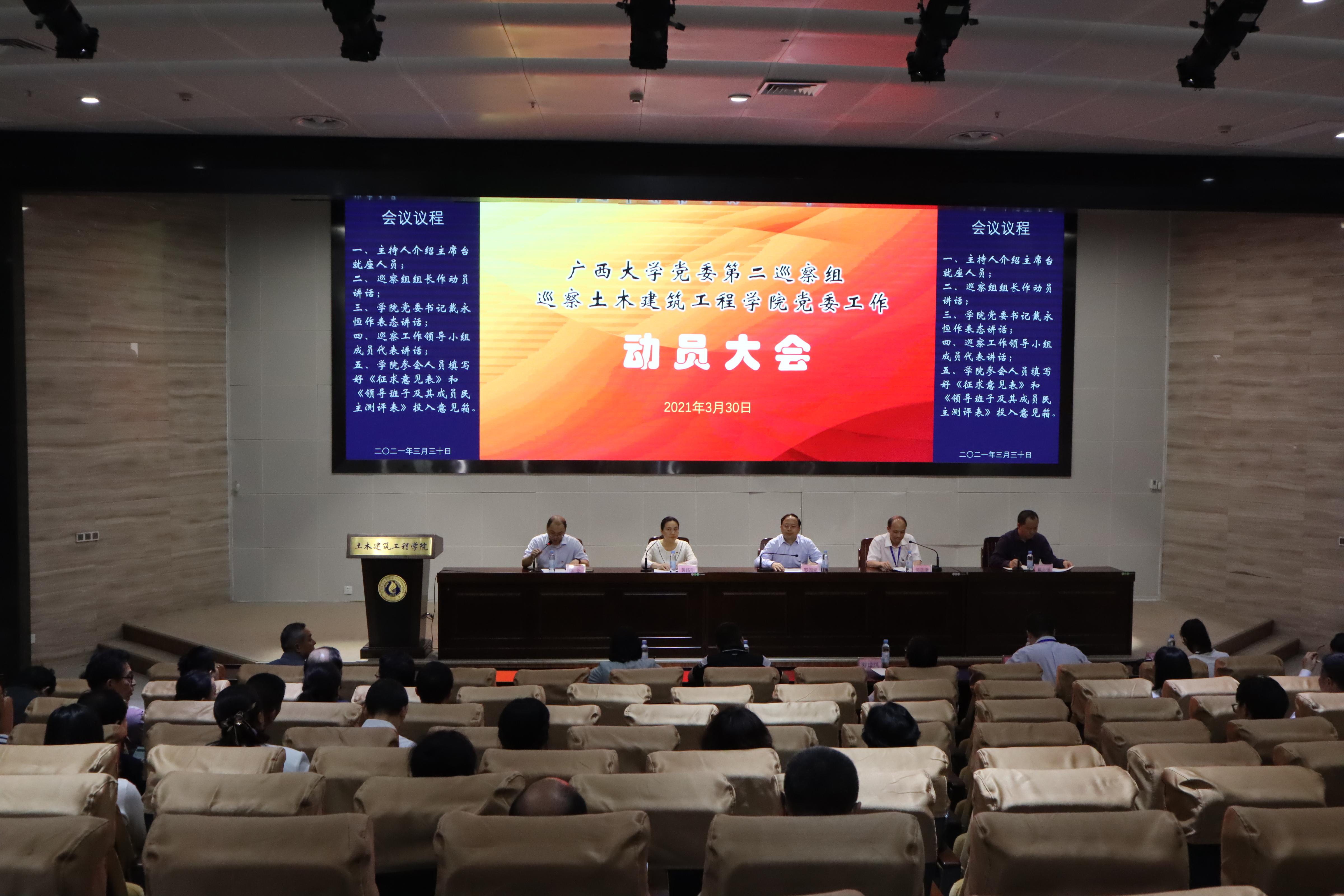 3月30日下午,校党委第二巡察组巡察а√中文在线资源库党委工作动员会在学院新结构平台综合楼报告厅召开。校党委巡察工作领导小组成员、校纪委副书记罗国斌,校党委第二巡察组组长何志清,副组长机械工程学院党委副书记黄路明,校党委第二巡察组全体成员、学院全体教职工和学生党员代表参加会议。会议由学院党委副书记、常务副院长陈正主持。