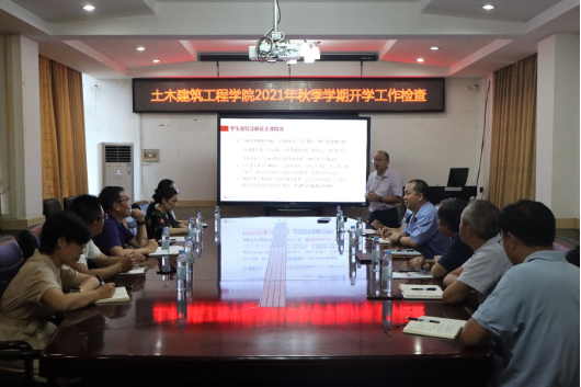 会上,学院党委书记戴永恒首先向韩副校长一行简要汇报师生返校情况以及暑期学院推进一流学科项目建设情况,并就学院在推进土木工程一流学科建设整改工作中遇到的难点堵点等问题进行了汇报,希望学校充分考虑学院目前建设的实际情况,在学院人才培养、师资队伍建设、基础实验条件改善等方面给予充分支持。学院党委副书记、常务副院长陈正代表学院向检查组全面介绍了2021年秋季学期开学工作的准备情况,主要包括学院疫情防控工作落实情况、师生报到及开学准备工作情况、本科及研究生教育教学情况、“十四五”规划编制等情况,并重点就土木工程一流学科建设情况进行了详细报告。