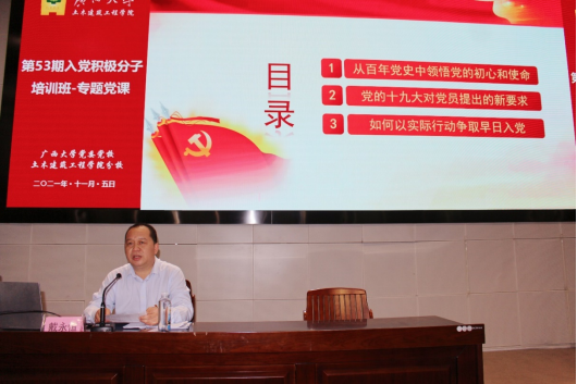11月5日下午,日本一区午夜艷熟免费党委党校а√中文在线资源库分校第53期入党积极分子培训班党课第一讲在新结构大厅综合楼报告厅开讲。学院党委书记戴永恒为300余名培训班学员讲授以“学习百年党史,领悟初心使命“为主题的专题党课。