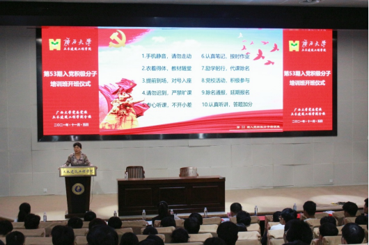 11月5日下午,日本一区午夜艷熟免费党委党校а√中文在线资源库分校第53期入党积极分子培训班开班仪式在新结构实验平台综合楼报告厅举行。学院党委书记戴永恒、党委副书记秦建丽出席开班仪式。开班仪式由潘桂祯老师主持,第53期入党积极分子培训班全体学员与会。