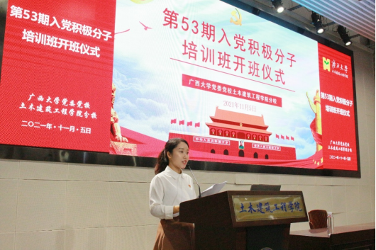 随后,培训班学员、2021级本科生张钰研作为学员代表发言。她认为,站在两个一百年的历史交汇点上,我们作为时代新人要继承和发扬伟大建党精神,坚定理想信念,以切实的行动提高自身素养,在实现中华民族伟大复兴中国梦的新长征路上奋勇搏击。她向全体学员倡议:时刻以一个优秀共产党员的标准来要求和鞭策自己,不断完善自己,发挥党员先锋模范带头作用,在实践中与党同心、与人民同行,将青春融入祖国山河之中。