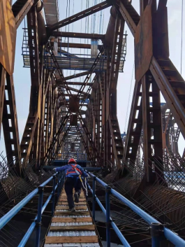 次日上午,陈正教授带领团队成员前往实桥现场,登上已经完成安装的拱肋节段,实地考察外包混凝土浇筑的施工现场,仔细查看拱肋结构,分析其底模布置、节段连接以及型钢节点对外包混凝土浇筑的影响,讨论传感器布设方案,为后续更好地开展天峨龙滩特大桥外包高性能混凝土的浇筑方案设计、保障外包混凝土的施工质量提供支持。