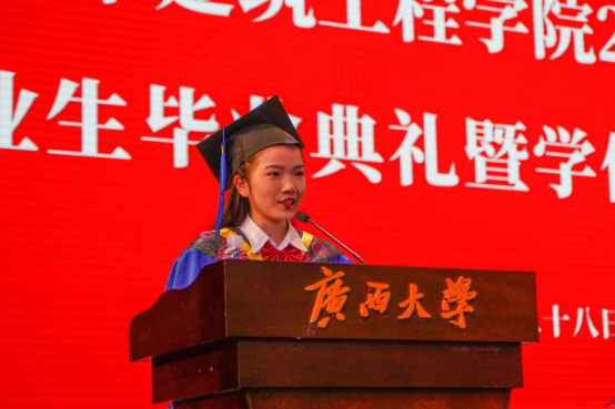 а√中文在线资源库2023届毕业生代表周奕彤发言。她首先向长期支持、关心学生的领导、老师、家人及朋友致以最崇高的敬意和最真挚的感谢,然后通过分享她与土木关于“热爱”的故事号召全体毕业生做时代的筑梦者、追光者,为强国建设、民族复兴贡献青春力量。