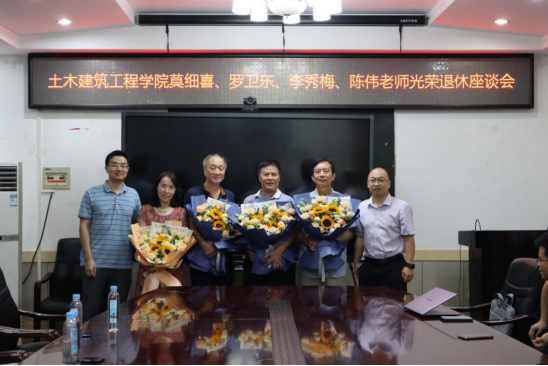 2023年7月14日上午,我院在土木楼三楼会议室为2023年6月正式退休的莫细喜老师、罗卫东老师,以及于2023年7月正式退休的李秀梅老师、陈伟老师举办了光荣退休座谈会。学院党委书记陈正,副院长宁裕忠、常岩军,教务处副处长彭林欣,以及与莫细喜等四位老师共事多年的老师们参加了座谈会。会议由宁裕忠副院长主持。