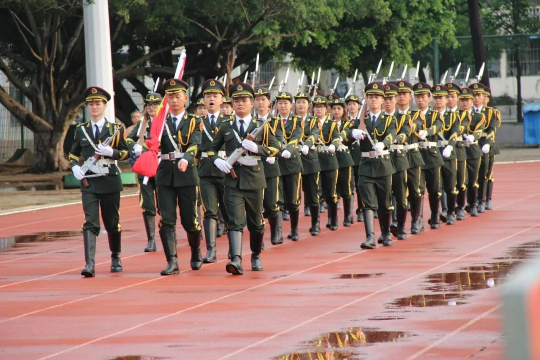 升旗仪式结束后,我院师生与国旗班同学在升旗台前合影留念。