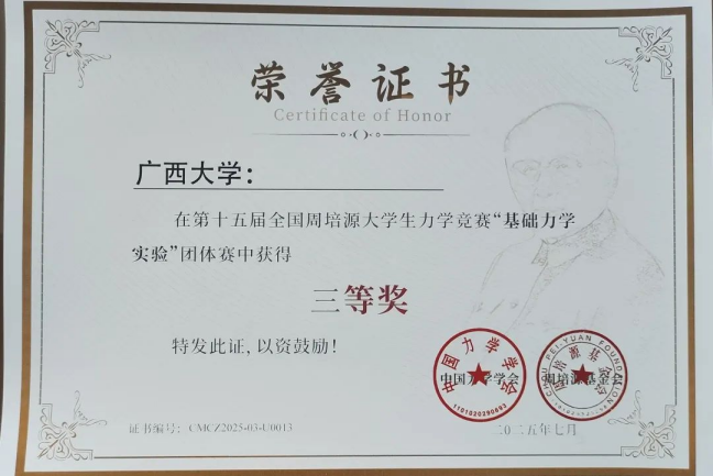 本次竞赛,我院教师苏潇阳和丛云跃指导的参赛队伍获得第十五届全国周培源大学生力学竞赛“基础力学实验”团体赛全国三等奖,是广西高校在本项赛事的历史性突破。参赛学生:陈立明、魏芝霖(机械工程学院)、周家旭、颜华南。