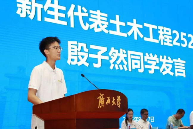 土木工程252班殷子然同学作为新生代表发言。校园风景如画,他怀揣梦想,将在西大土木这片“沃土”成长。他用充满激情的语言展开讲述,从立校初心讲到学院训言,从马君武先生的教育精神到郑皆连院士的科学家精神,他向同学们表达了对未来的坚定信念:“我们定能练就如平南三桥般坚实的实力,打磨如天峨龙滩特大桥般承载千钧的本领。”同时,他呼吁全体新生早立鸿鹄志,骑马踏平川,博观约取,厚积薄发,为土木工程世界一流学科贡献青春力量。