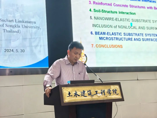 会议伊始,泰国宋卡王子大学Prof. Suchart Limkatanyu作了题为“Finite Frame Elements with Longitudinal and Lateral nterfaces: From Earthquake Engineering to Nanotechnology”的学术报告。他从有限框架单元公式、钢筋混凝土结构粘结-滑移效应、土-结构相互作用、纳米线弹性衬底系统、梁弹性基板系统几个方面介绍了他们团队主要研究内容,并对研究成果进行了总结。